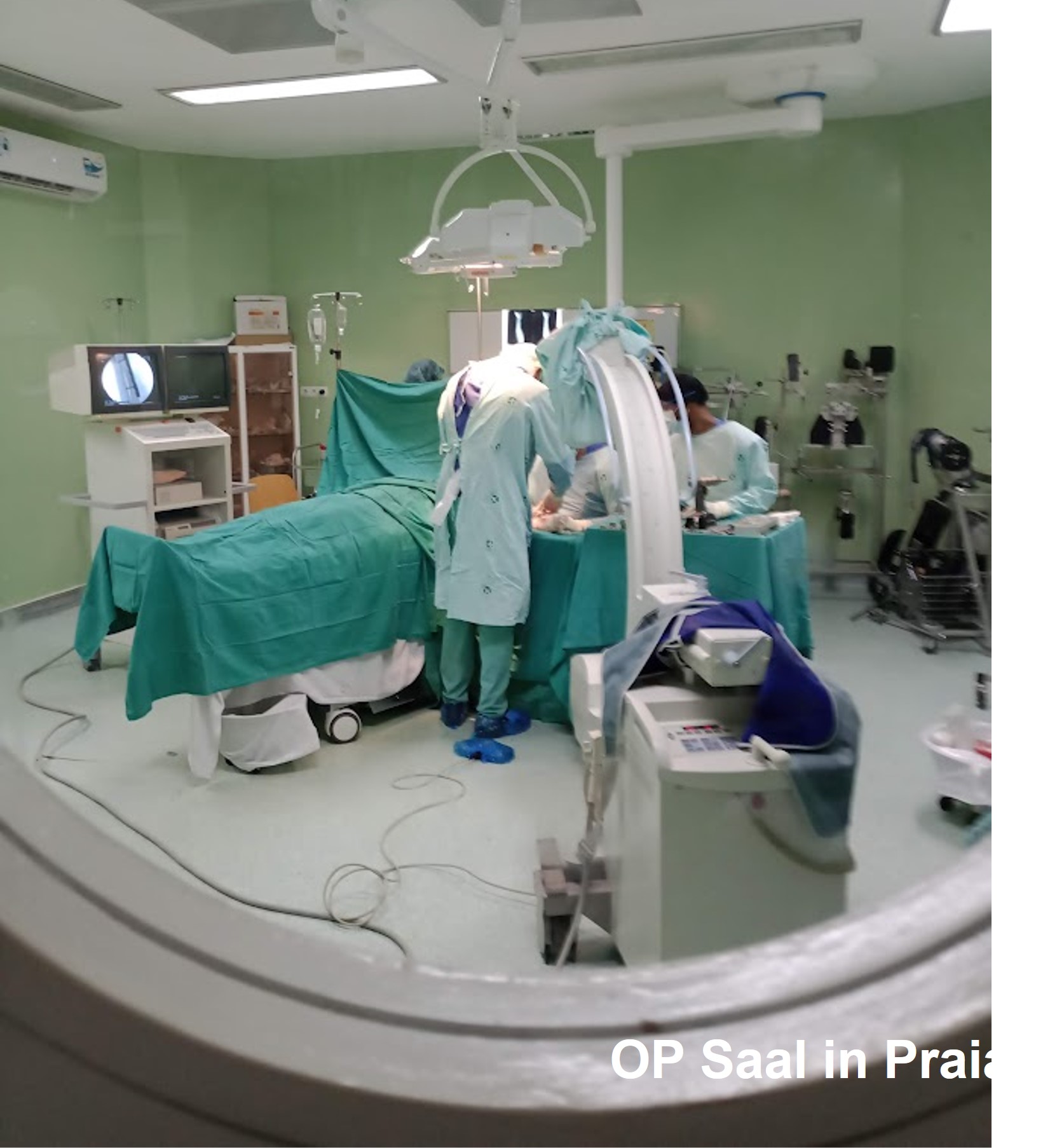 Von Seiten der chirurgischen Kolleginnen und Kollegen wurden verschiedene Operationen begleitet und gemeinsam mit den kapverdischen KollegInnen OP-Techniken und Herausforderungen diskutiert und gemeistert (Drs. Kohlmann / Al-Beyramani / Schirmer). Dabei handelte es sich um 2 Unterschenkelpseu-doarthrosen (die eine mit Nagel, die andere mit Platte und Spongiosaplastik versorgt), eine distale Femurfractur (retrograder Verriegelungsnagel), einen Verrenkungsbruch der Handwurzelknochen (scapholunäre Luxationsfractur) und eine mediale Schenkelhalsfraktur, die mit einer bipolaren Hemiprothese versorgt wurde. Dabei zeigt sich wieder, dass die operativen Fähigkeiten unserer kapverdianischen Kollegen längst mitteleuropäisches Niveau aufweisen, haben doch Dr. Keita und Dr.Tavares ihre jeweils 3 jährige Fachausbildung am Wilhelminenspital (jetzt Klinik Ottakring) absolviert. Das größte Problem ist derzeit der Nachschub und die Logistik der Implantate und Instrumente. Im HAN arbeitet man an einer Lösung. Einige dringende Instrumente (vorallem neue, scharfe Bohrer) haben wir von Cosmas gekauft und mitgebracht. Die Weiterentwicklung der Endoprothetik, der Arthroskopie und den Einstieg in die so dringende Wirbelsäulennotfallchirurgie wollen wir, was die Fortbildung betrifft, besonders unterstützen.