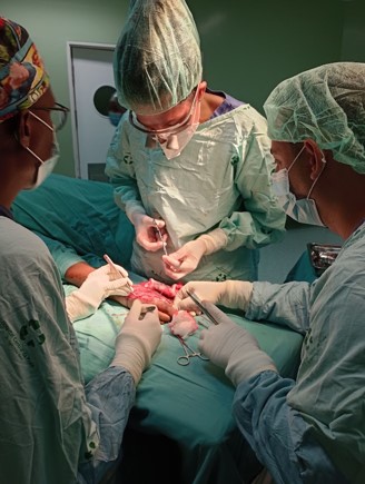 Neben den orthopädisch/unfallchirurgischen Operationen war auch die Diskussion, Planung und assistierte Durchführung von rekonstruktiven Eingriffen ein Thema der Zusammenarbeit (Dr.Boyce), ein Aufgabengebiet, dem in Zukunft vermehrt Augenmerk geschenkt werden soll. Ein großer Haut- und Sehnendefekt am Handrücken wurde mit Sehneersatz und gestielter Lappenplastik von Dr.Tavares unter Anleitung von Dr.Boyce durchgeführt.