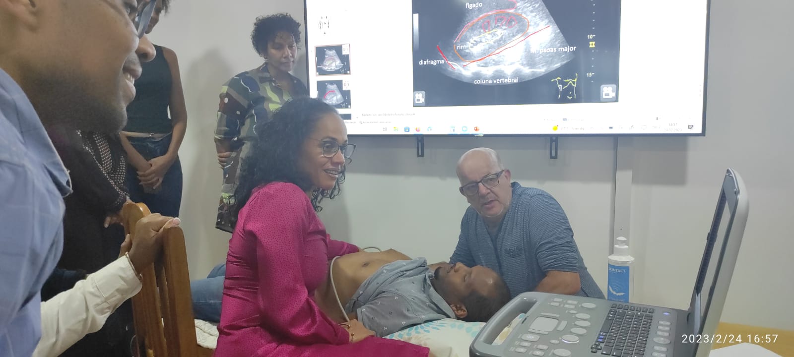 Wie schon beim vorletzten Besuch im Februar 2020 hielt Dr. Stefan Pöchacker auch dieses Mal einen Vortrag im ORDEM dos MEDICOS, der Ärztekammer von Cabo Verde, wobei die Fortbildung via ZOOM auch an Teilnehmende der anderen Inseln übertragen wurde. Auf den Vortrag über Ultraschalluntersuchung bei lebensbedrohlichen Krankheitsbildern (FAST / RUSH-Konzept) folgten praktische Übungen durch die Teilnehmerinnen und Teilnehmer, die den Untersuchungsgang mit dem Ultraschallgerät direkt trainieren konnten.